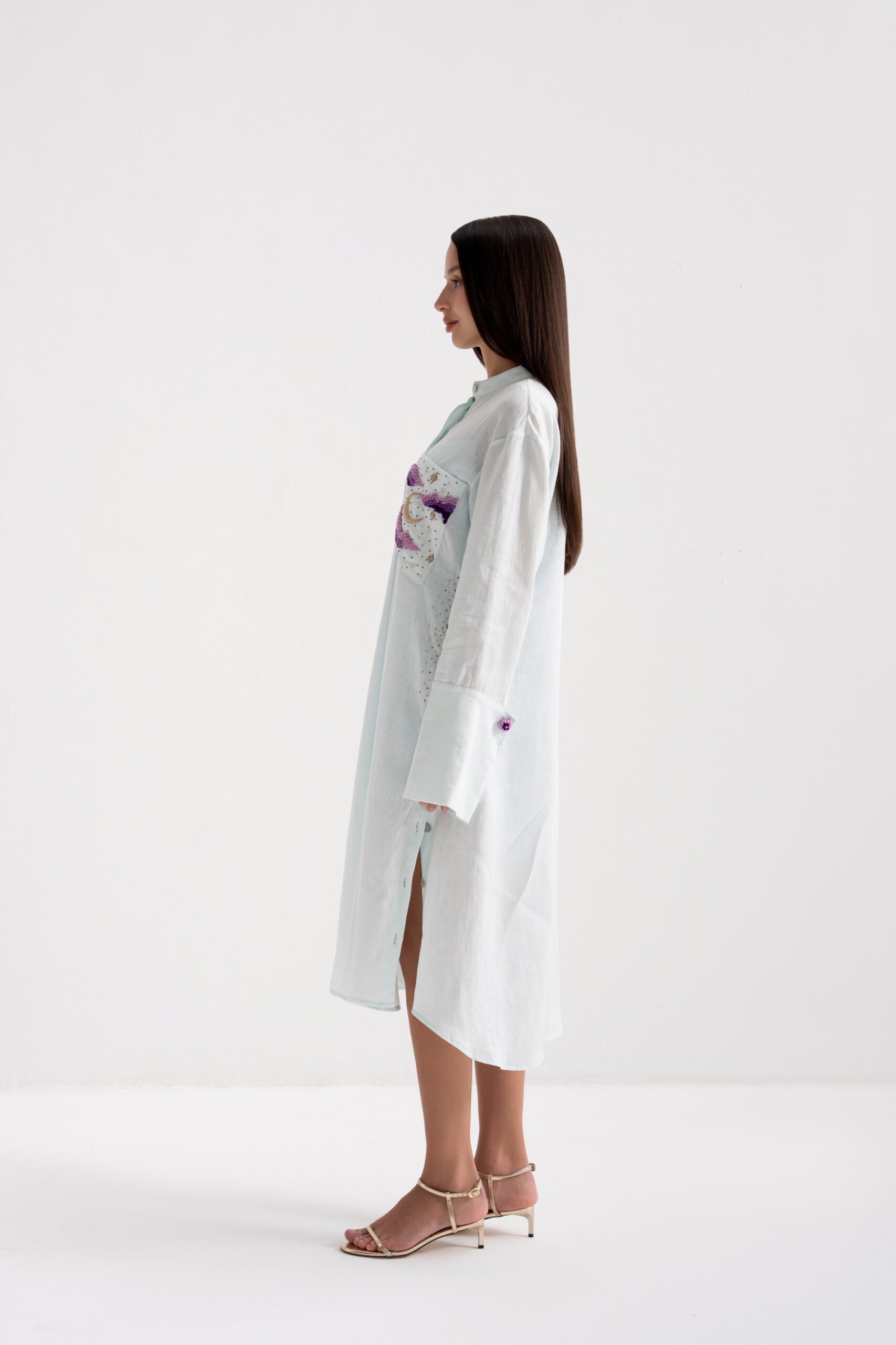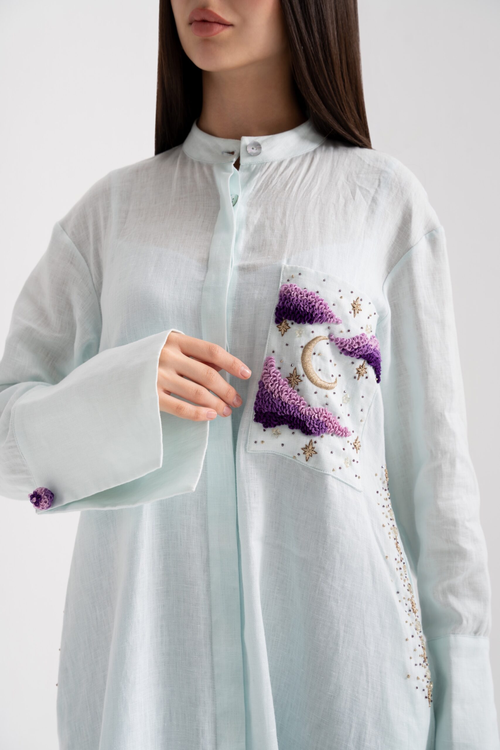 Moonlight features a relaxed, fluid silhouette crafted from breathable linen, delicately adorned with subtle hand embroidery inspired by celestial details. Featuring hand-embroidered side pockets and hand-finished cuff buttons, each detail reflects refined craftsmanship and understated elegance.