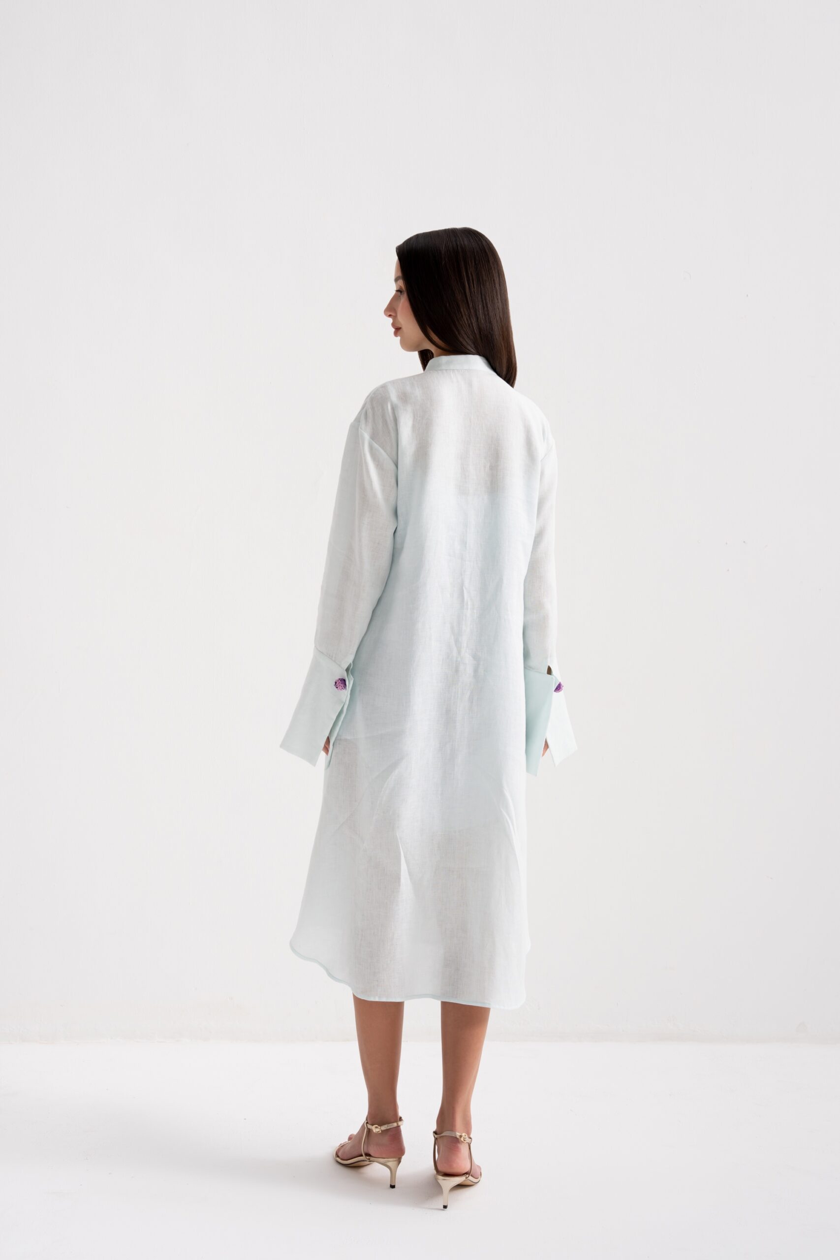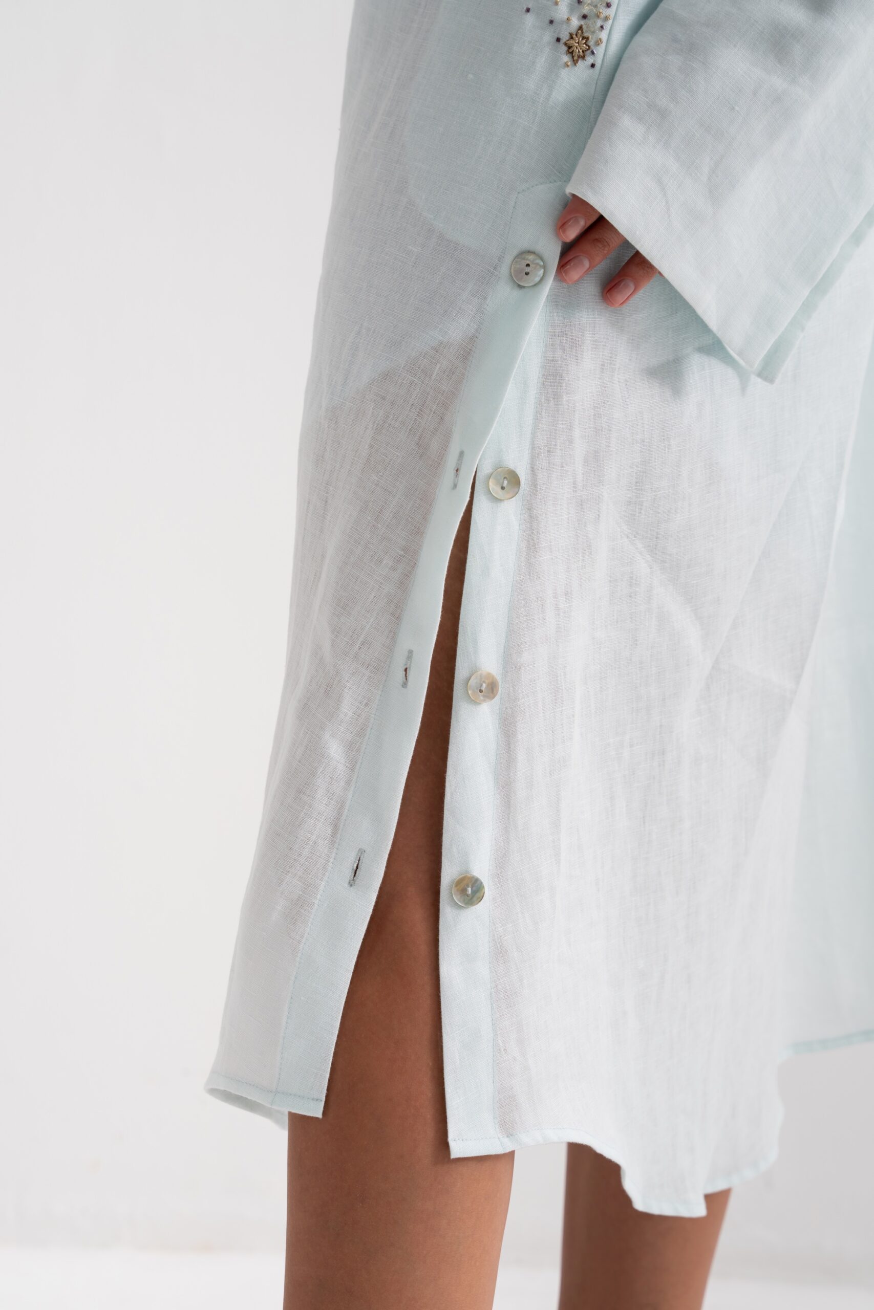 A softly flowing linen dress shirt with subtle hand embroidery, paired with a matching inner dress.